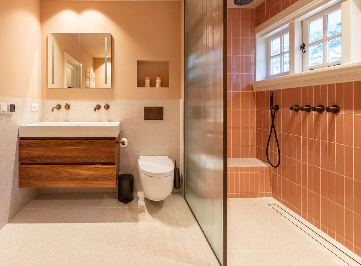 Voor deze woning in Blaricum realiseerde TÉGL het tegelwerk op de begane grond en in de badkamer. Er is gekozen voor een natuurlijke vloer met subtiele variatie en terrazzo tegels die samen zorgen voor rust, samenhang en een verfijnd geheel.