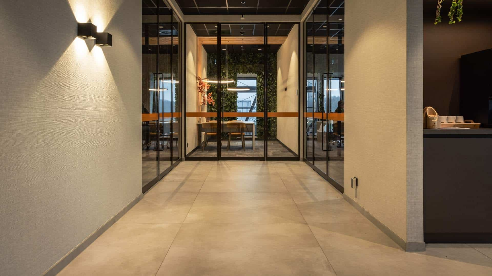 Het kantoor van Hardeman Egg Group is voorzien van grote betonlook tegels op vloer, wand en als plint. De entree, gangen en kantoren hebben hiermee een moderne, natuurlijke look waar heerlijk in gewerkt kan worden.