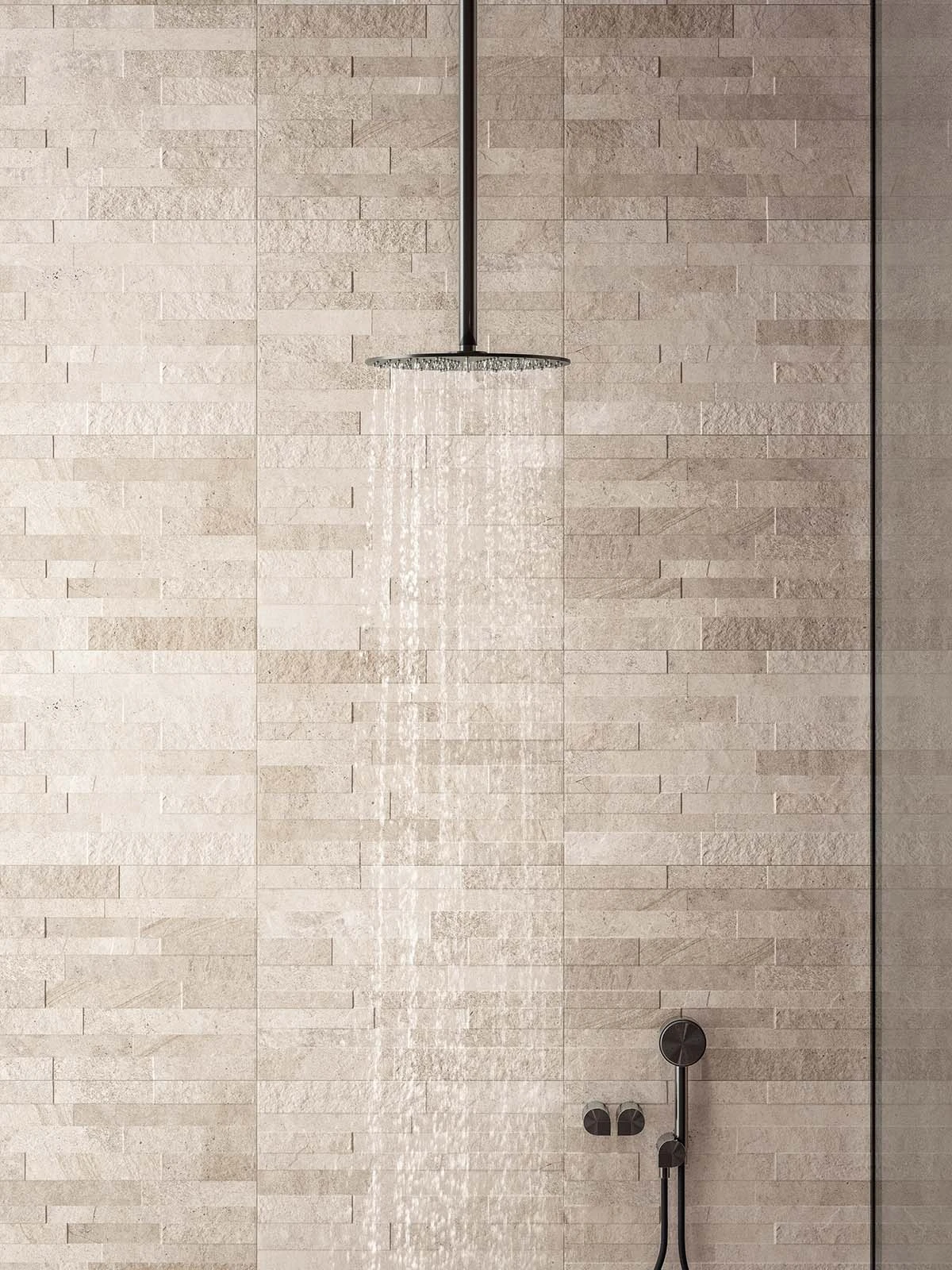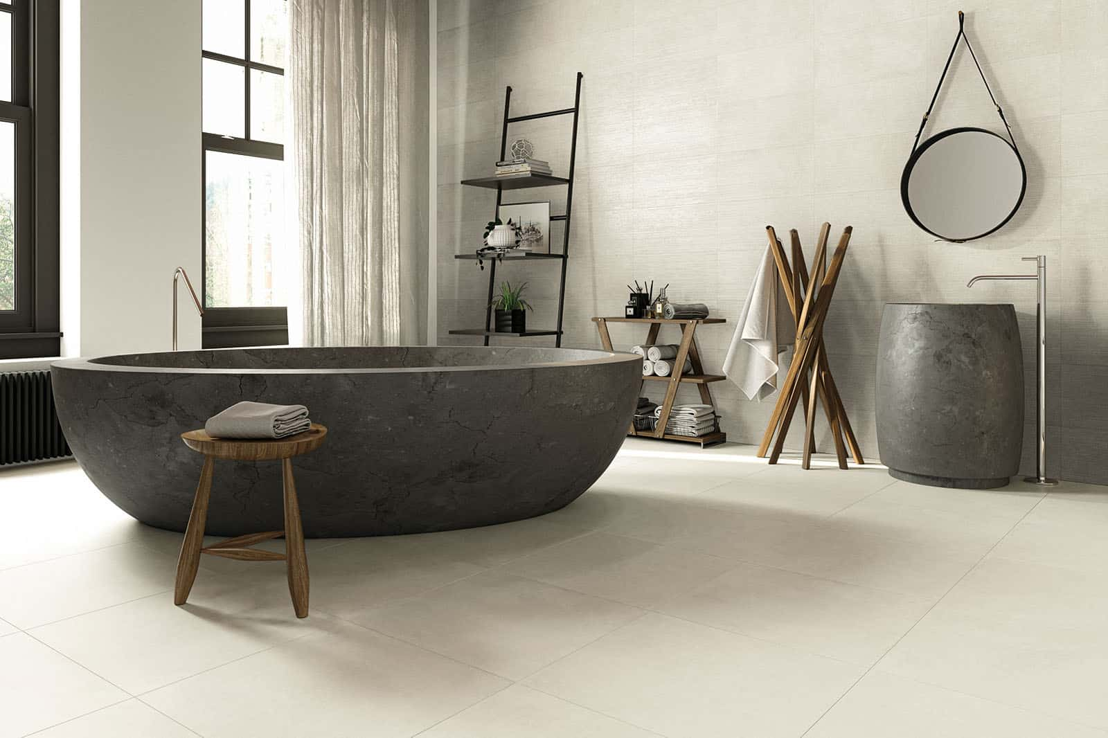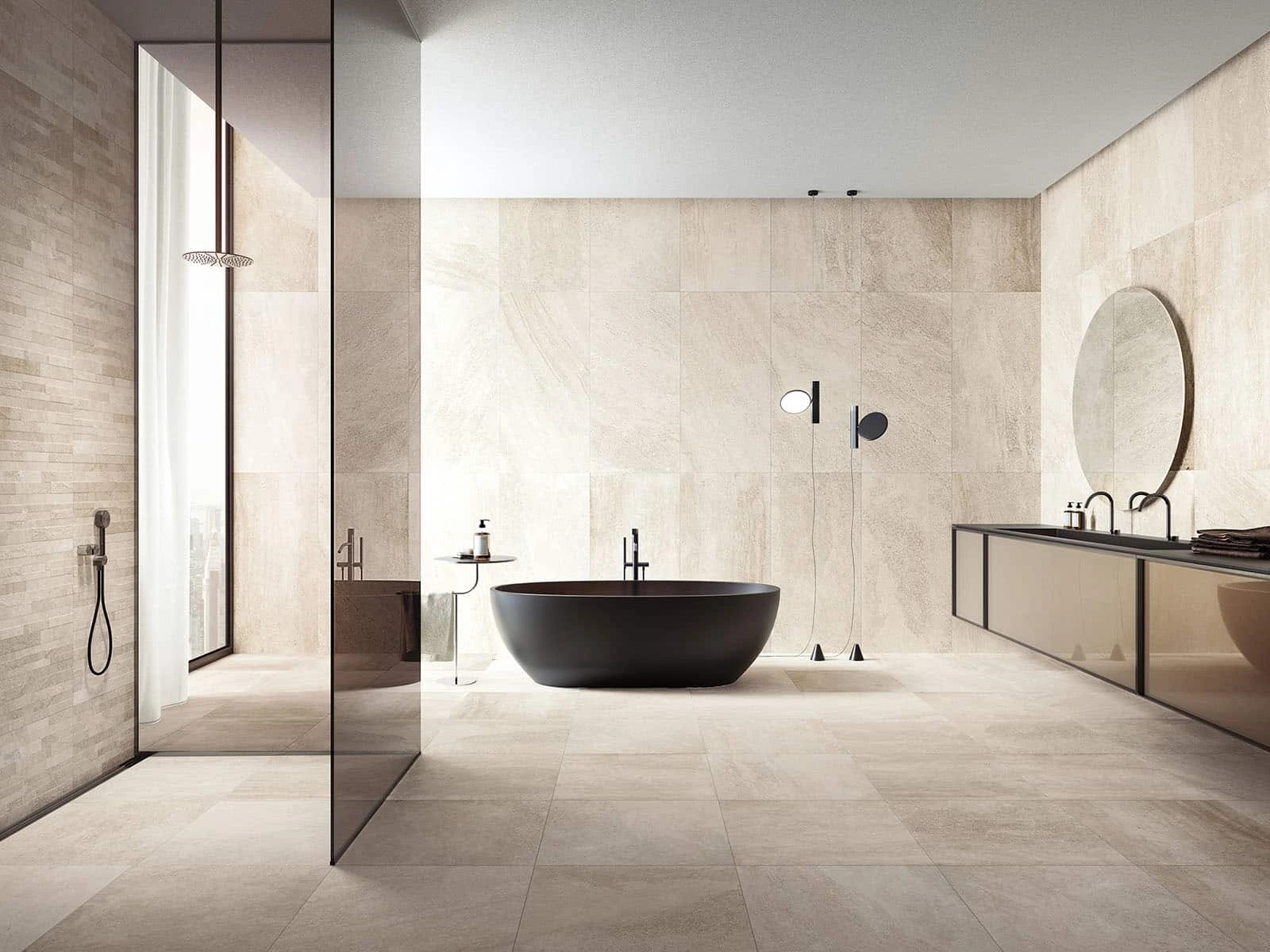 Zandkleurige tegels in elk badkamerontwerp