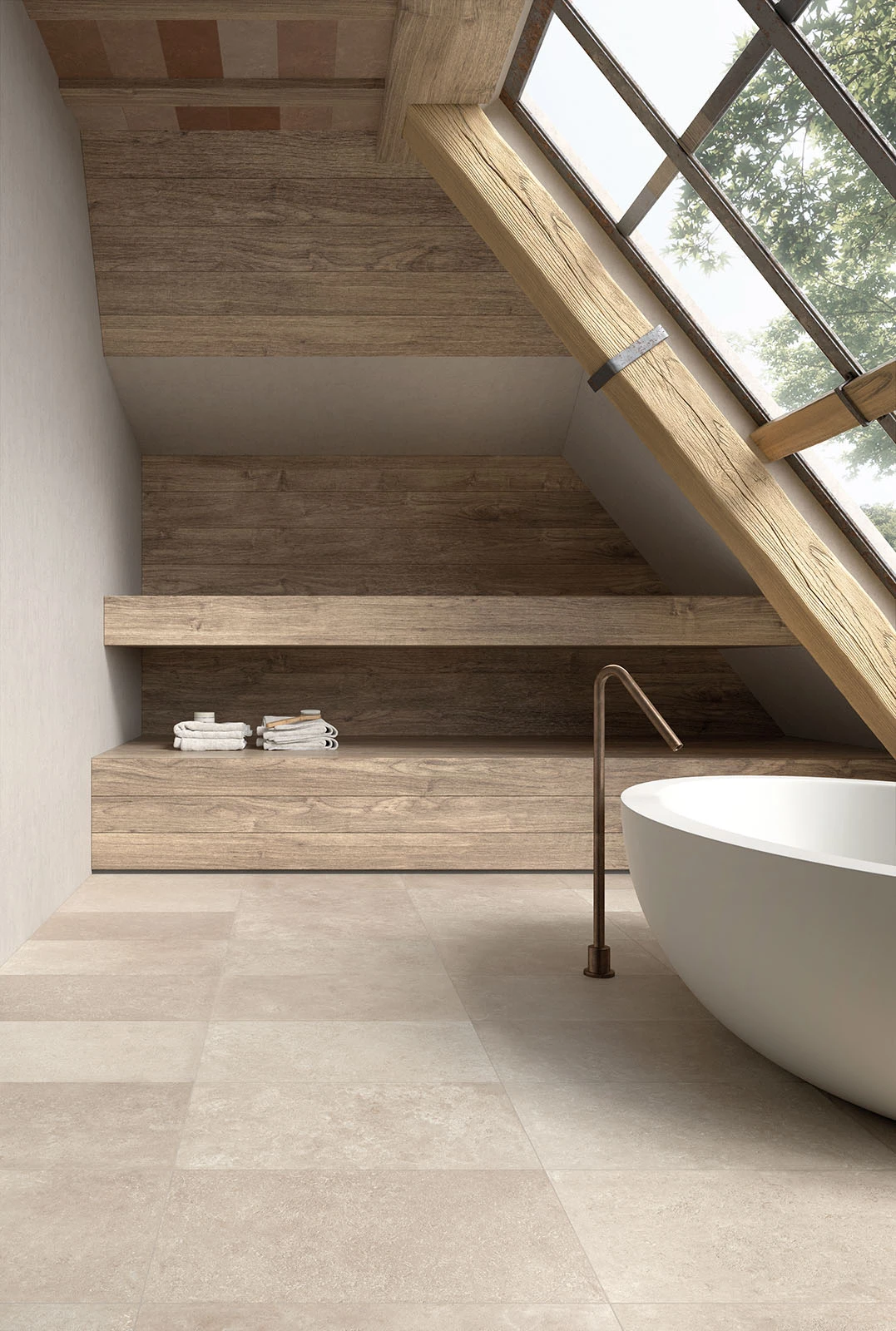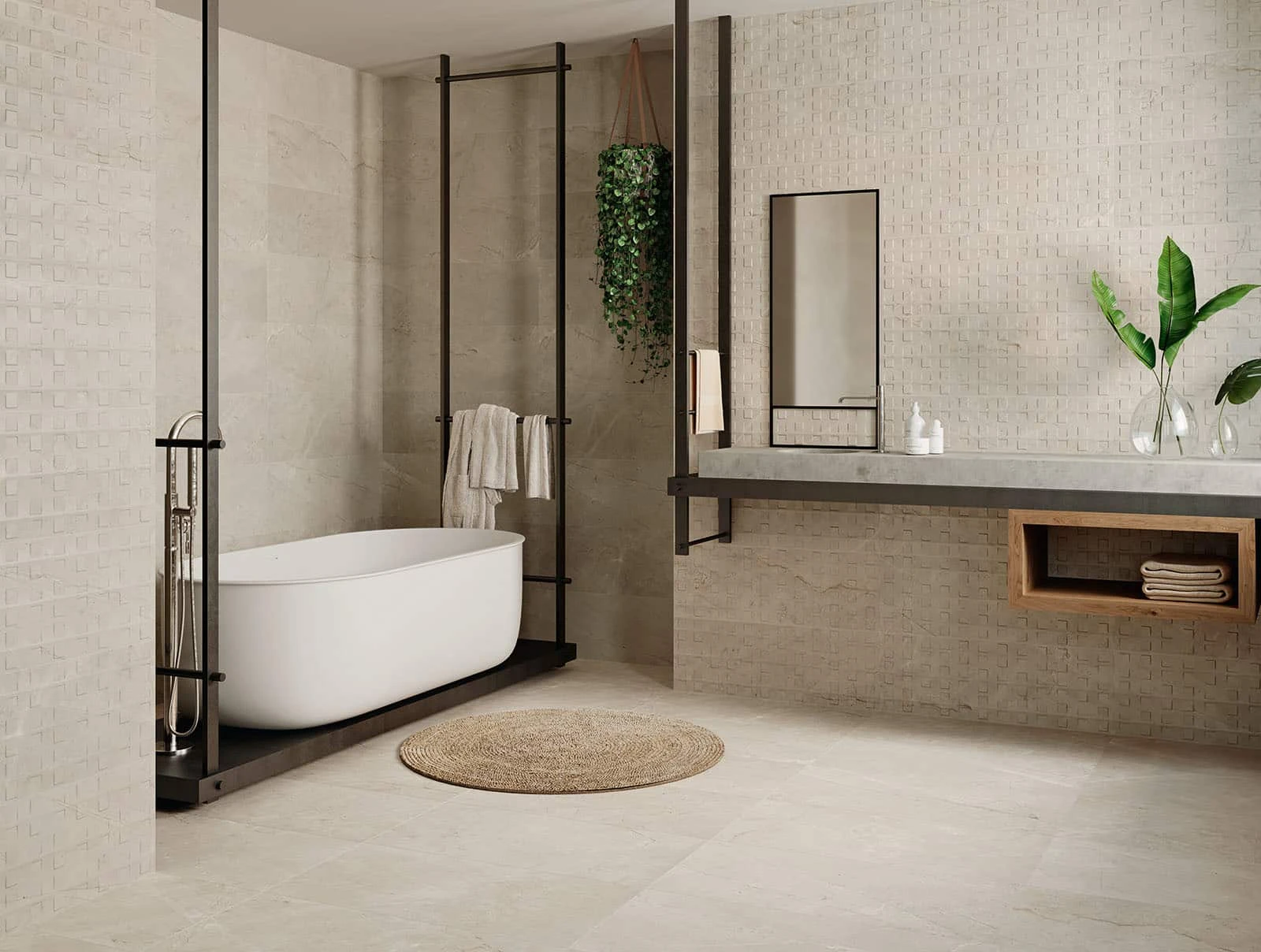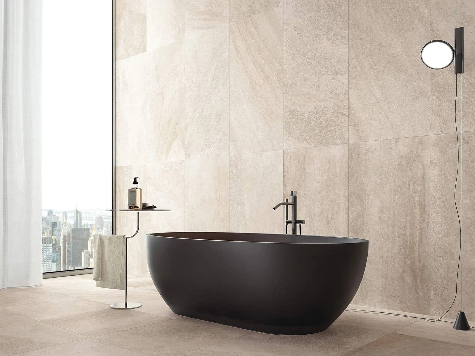 Zandkleurige tegels in elk badkamerontwerp