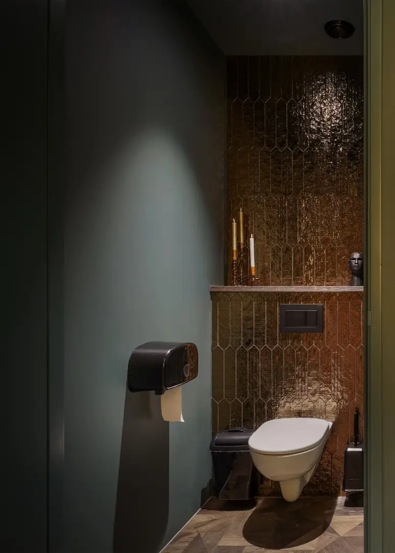 In de keuken en het toilet koos Rhetap voor gouden tegels met patroon, die zorgen voor contrast en een exclusieve uitstraling. Met de donkere vloeren en wanden ontstaat er diepte en intimiteit in de ruimte. Lichte meubels en accessoires springen er zo extra uit. Door dezelfde tegel ook door te trekken in het keukeneiland ontstaat een krachtig, consistent ontwerp.