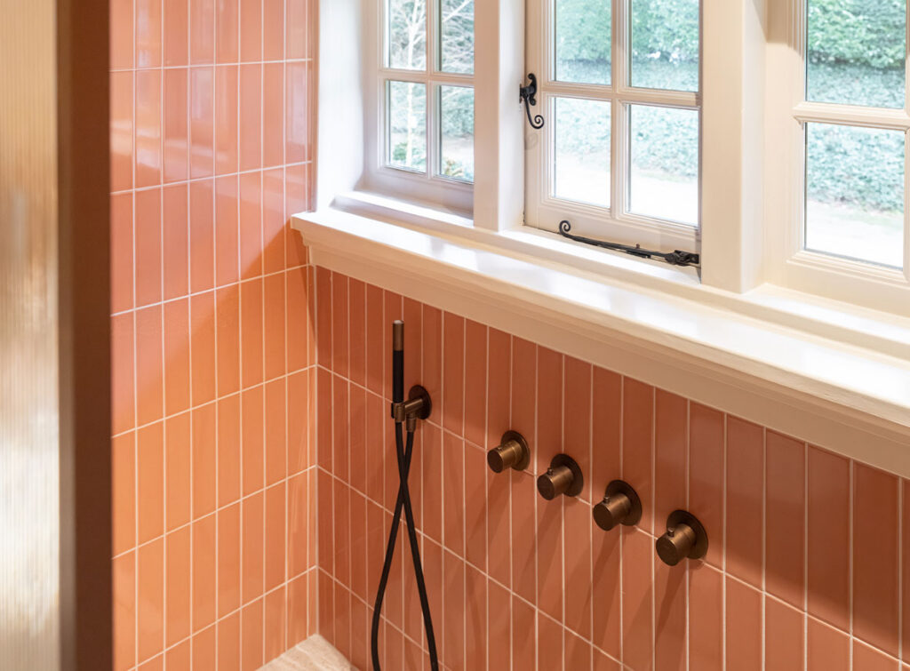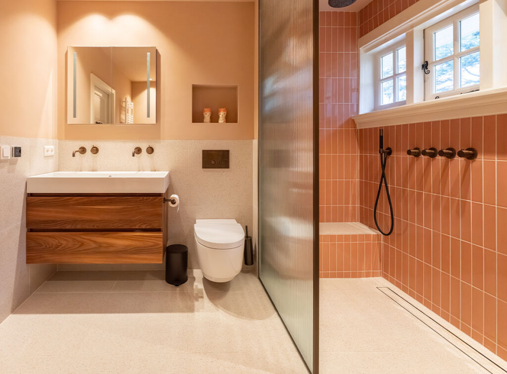 In het douchegedeelte zijn langwerpige wandtegels toegepast. Deze geven de ruimte een verfijnd detail zonder de rust te verstoren. Door het verschil in formaat ontstaat er net genoeg contrast om het geheel interessanter te maken.