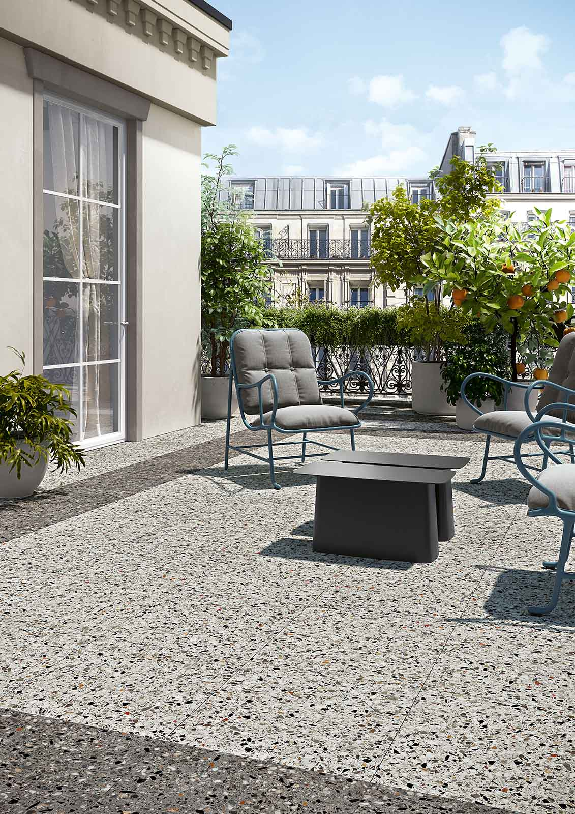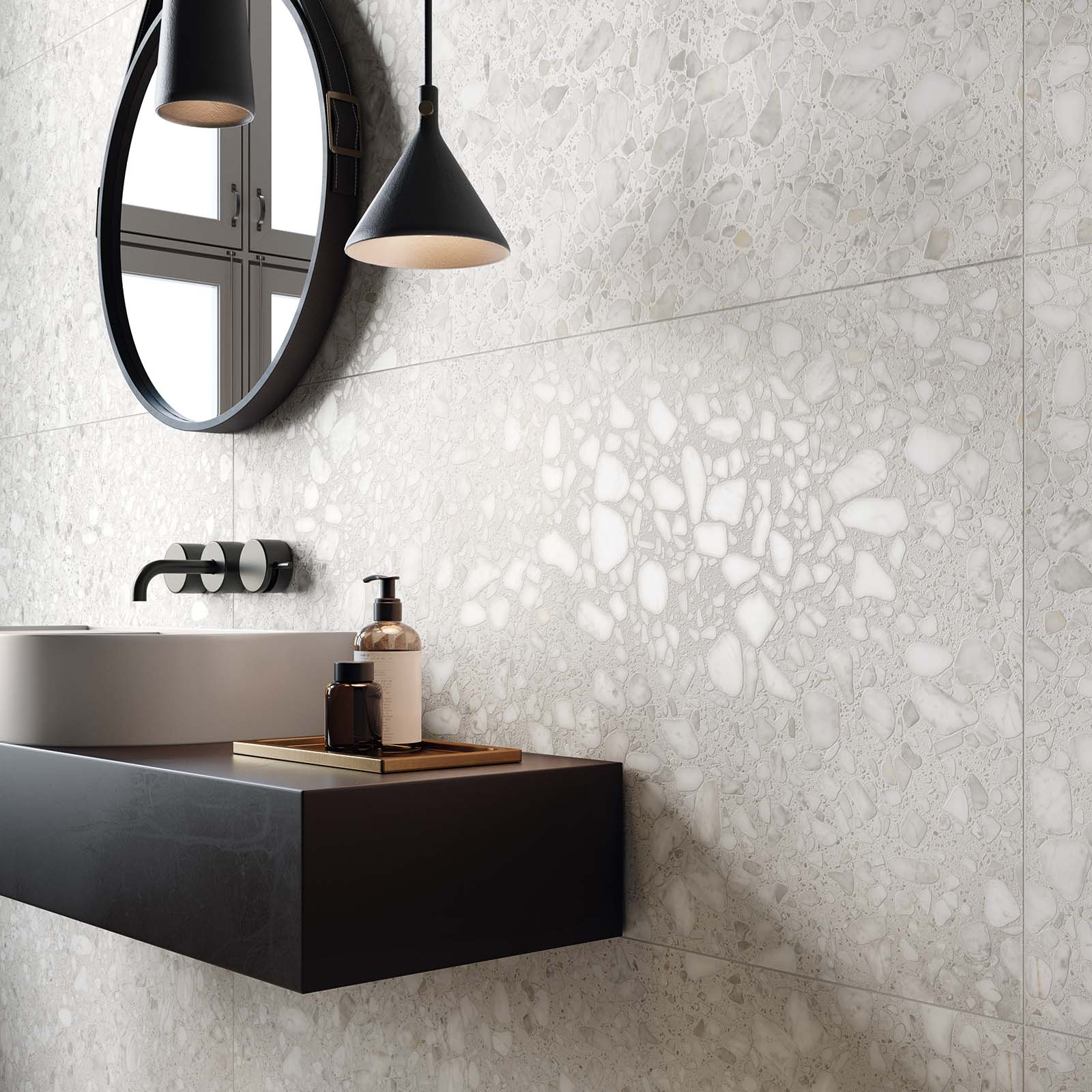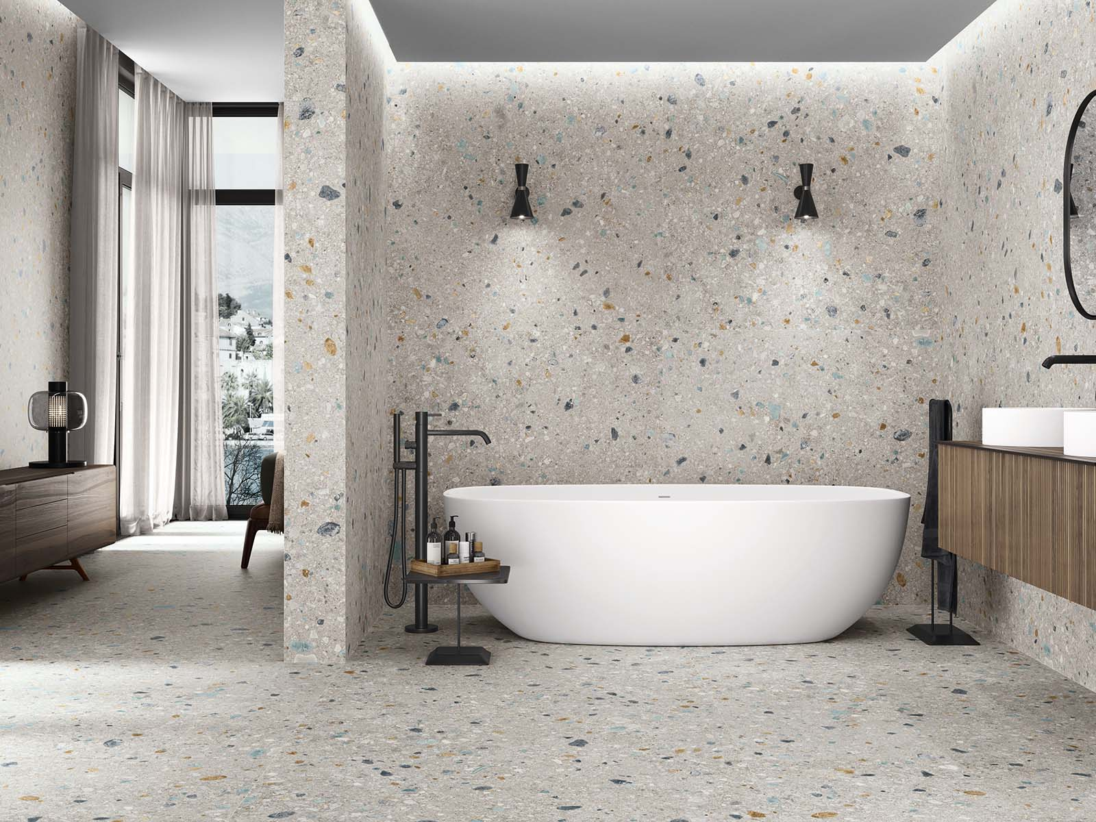 Onze keramische tegels met een terrazzo print zijn robuust en bestand tegen slijtage. Ideaal voor drukbezochte ruimtes, zoals keukens, badkamers, en entrees, maar ook voor buitentoepassingen, zoals terrassen en opritten. De bestendigheid tegen weersomstandigheden en intensief gebruik maakt terrazzo een slimme investering voor elke ruimte.